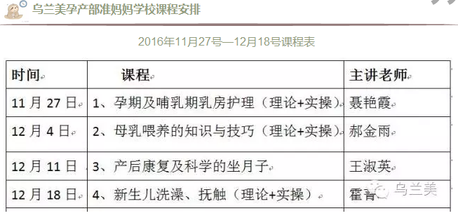 【通知】烏蘭美孕產(chǎn)部準(zhǔn)媽媽學(xué)校課程通知發(fā)布時間: 2016-11-25 -